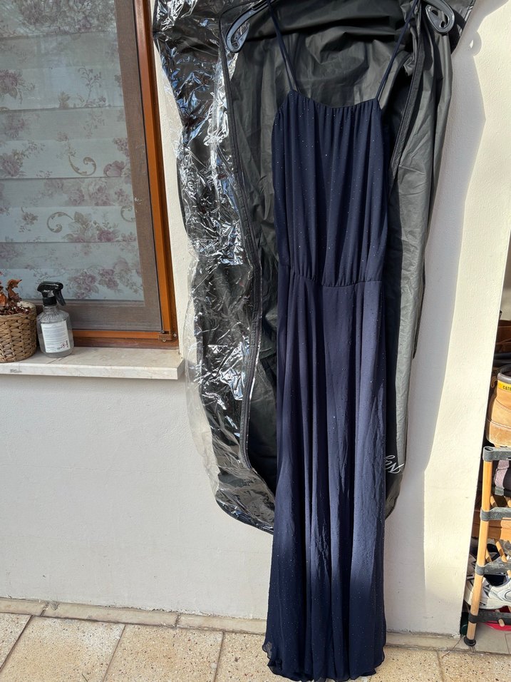 Lacivert uzun drapeli, straplez ve kolsuz elbise. Sentetik kumaştan, dar kesim, Paris tarzı sokak modasına uygun, açık hava kullanımı için ideal.