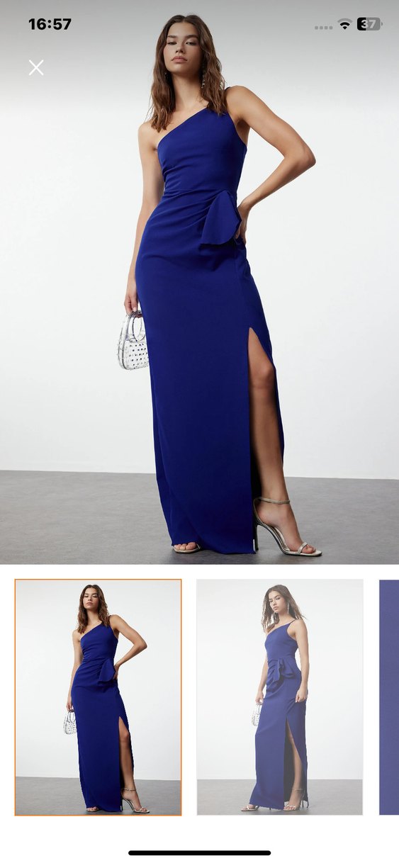 Lacivert, vücuda oturan uzun elbise, straplez yaka ve drapeli detaylı, yan yırtmaçlı, ipeksi kumaştan yapılmış, düğünler için uygun.