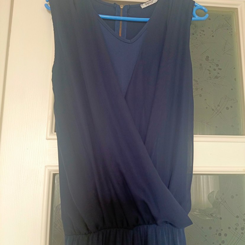 Kadınlar için uzun, drapeli, V yakalı ve kolsuz tulum. Rahat kesimli ve ipeksi dokulu, ofis için uygun lacivert renktedir.