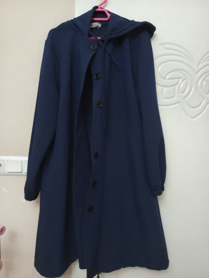 Kapüşonludur ve sadece bir düğmesi eksiktir indirim yapılır. Kadınlar için lacivert uzun kaban, düğmeli ön ve kesik yakaya sahiptir. Yumuşak ve sıcak kumaştan, bol kesim ve uzun kolludur. Minimalist ve normcore tarzda günlük kullanım için uygundur.