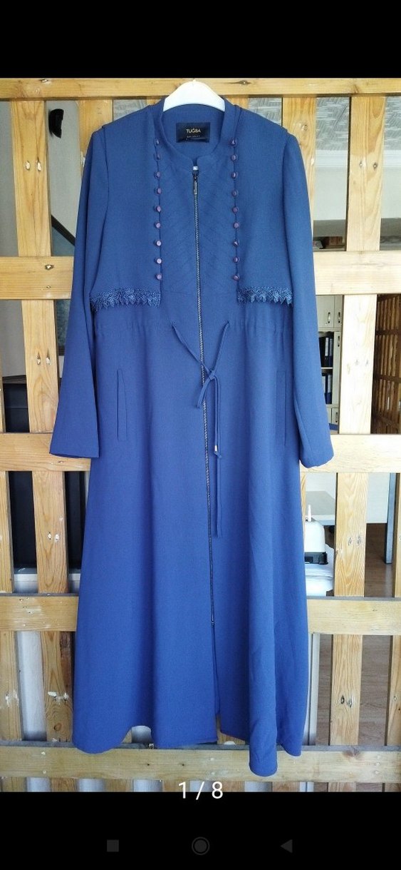 Kadınlar için lacivert uzun kaban, kesik yaka ve düğmeli detaylara sahiptir. Bol kesim, uzun kollu ve nakışlı desenlidir, sentetik kumaştan üretilmiştir. Günlük kullanıma uygun, sade ve mütevazı stil.