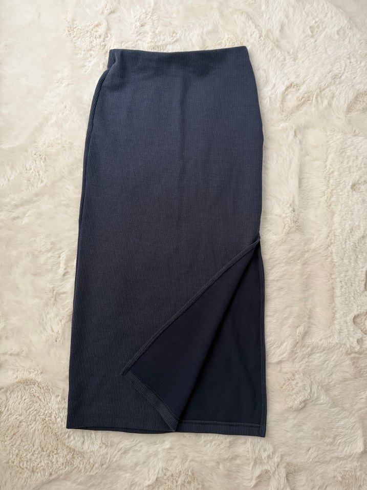 Kadınlar için uzun, vücuda oturan etek. Yumuşak ve sıcak kumaştan, lacivert renkte olup günlük kullanıma uygundur. Yandan yırtmaçlı midi boy etek, bedeni S-M bedenler için uygundur, boyu-82cm