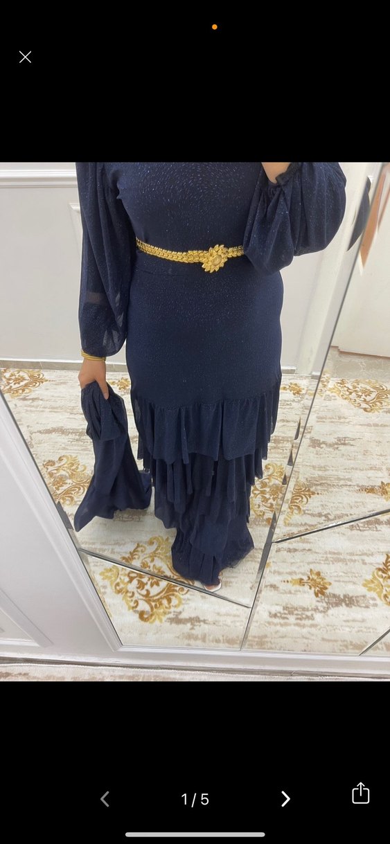 Lacivert uzun elbise, fit kesim ve fırfır detaylara sahiptir. Yüksek yakalı, askılı ve koyu renkli sentetik kumaştandır, düğün için uygundur. ✨