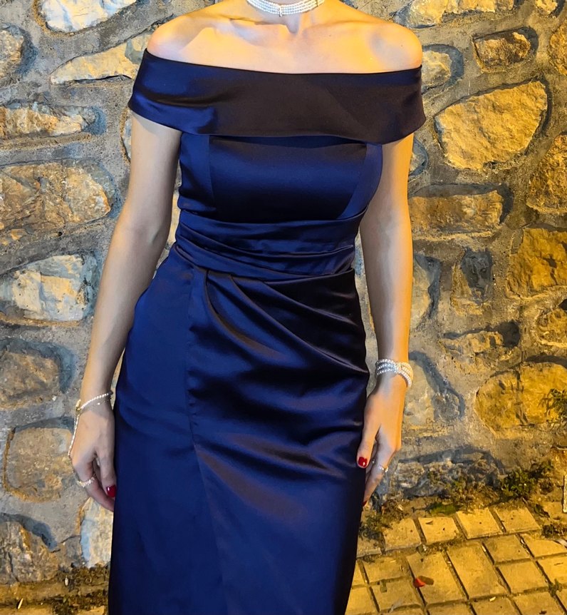 Lacivert uzun,gece elbisesi. Kayık yaka, parlak kumaşı düğünler için uygundur. Önden yırtmacı ve arkada küçük bir kuyruk mevcuttur.
