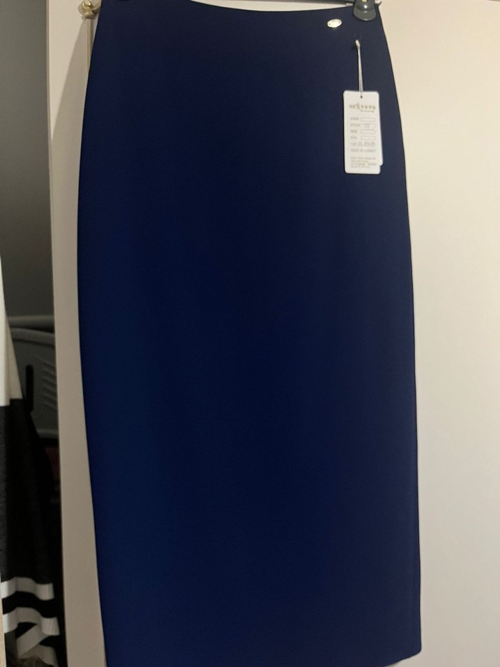 Kadınlar için uzun, kemerli ve normal kesim lacivert etek. Düz desenli, sentetik kumaştan, ofis kullanımı için uygundur.