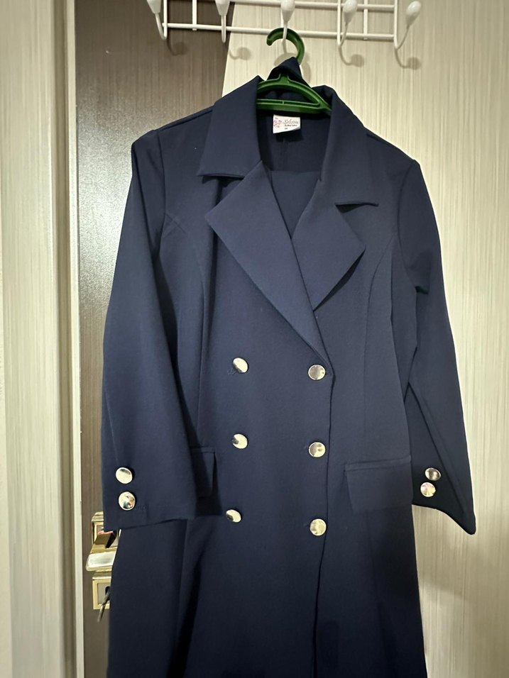 Kadınlar için düğmeli, yakası kesimli ve uzun kollu lacivert blazer. Ürünü kullandım ama herhangi bi sorunu yok