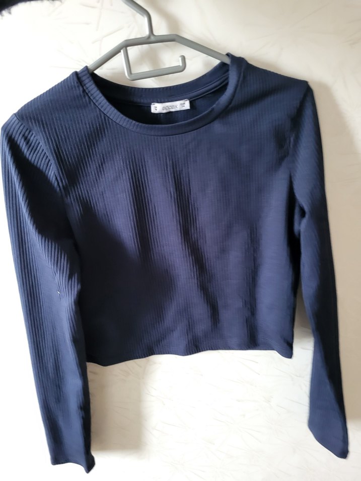 Kadınlar için uzun kollu, bisiklet yaka ve pileli dokulu lacivert bluz. Yumuşak sentetik kumaştan üretilmiştir, günlük sokak stili için uygundur.