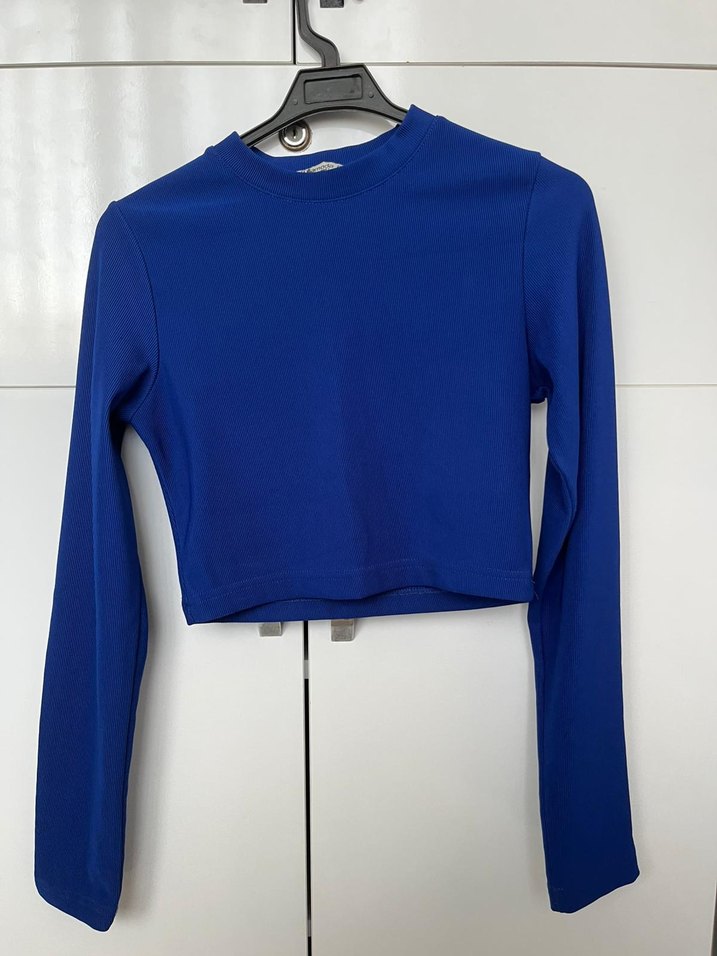 Kadınlar için uzun kollu, bisiklet yaka ve fitted kesime sahip lacivert crop top. Yumuşak ve sıcak kumaştan yapılmış, günlük kullanıma uygun sade streetwear tarzı. Temiz hiçbir deformesi yok.