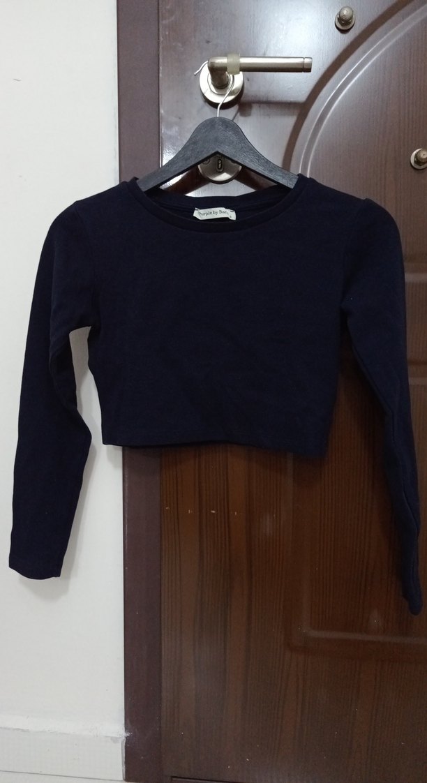 iyi durumda lacivert , uzun kollu, yuvarlak yaka ve vücuda oturan kesime sahip crop top. Minimalist tarzda, günlük kullanım için uygun.