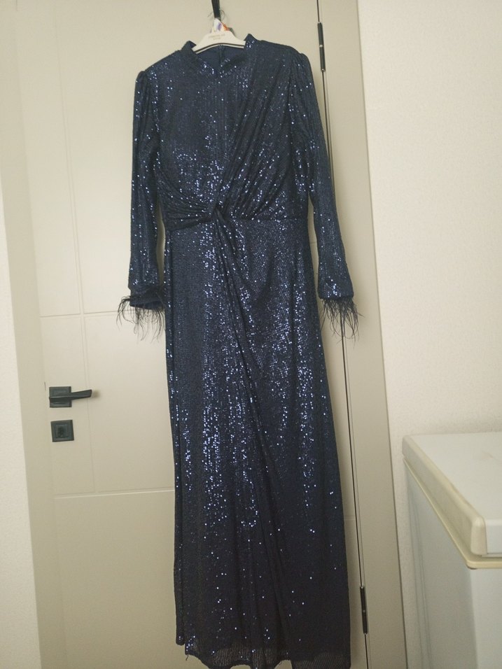 Kadınlar için lacivert, uzun kollu, drapeli tasarımlı abiye elbise. Notlu yaka ve düzenli kesim ile gece partilerine uygun şık bir model.esnek 46 48 neden uyumlu sadece dış çekimde gıyıldı sıfırdan farksız✨