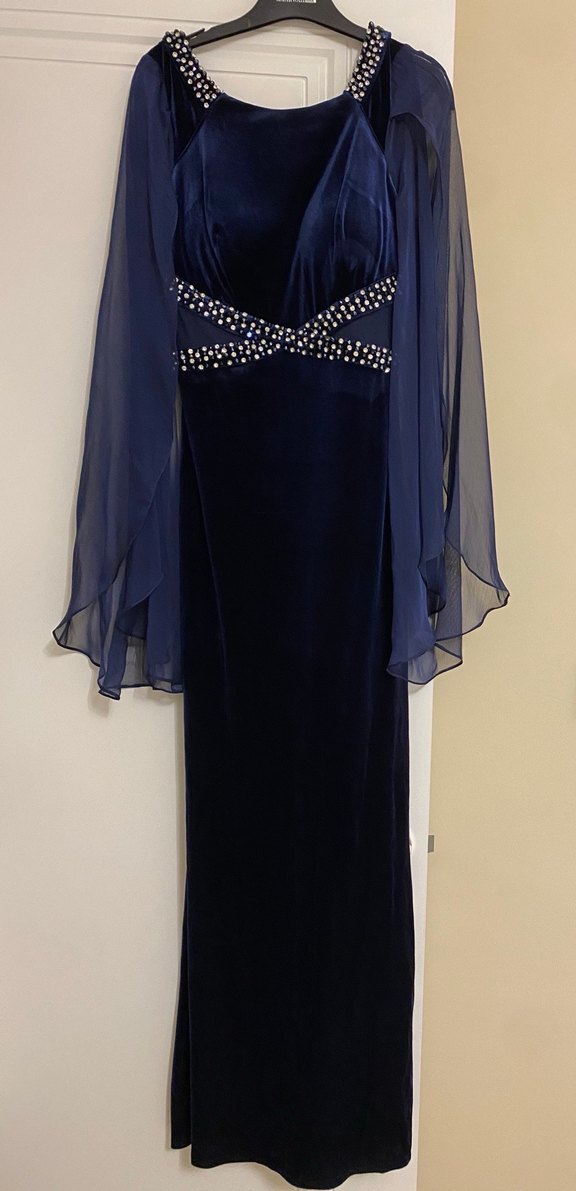 Lacivert, v yaka, uzun kollu ve drapeli bu dar kesim abiye elbise, bel kısmında taş süslemelidir. Gotik düğünler için uygundur.