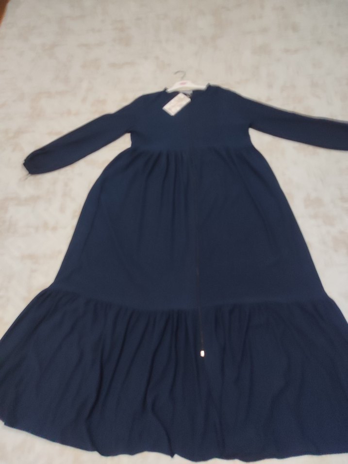 Kadınlar için uzun, bol kesim, uzun kollu ve V yakalı elbisedir. Yumuşak ve sıcak kumaştan yapılmış, fırfır detaylıdır. Lacivert rengi günlük kullanıma uygundur.