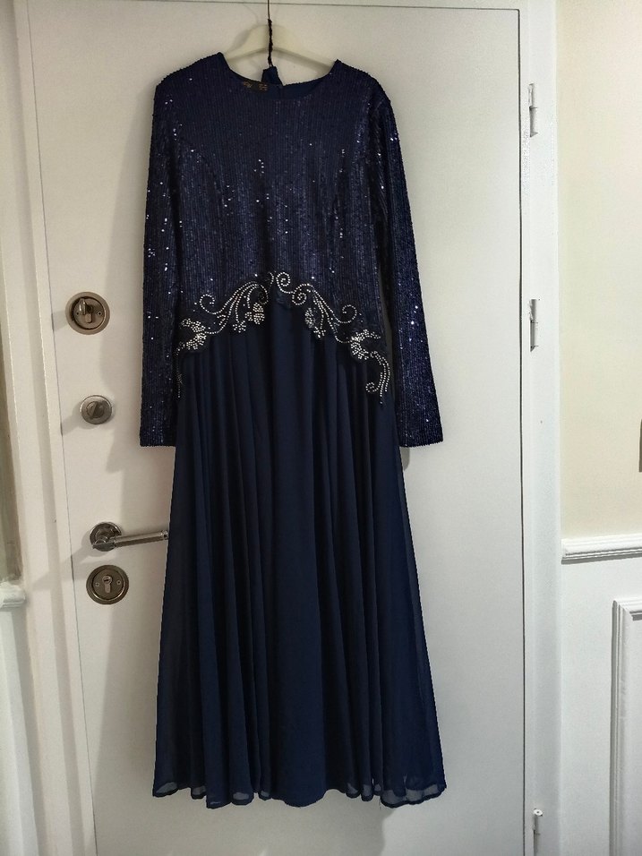 Lacivert uzun kollu, yuvarlak yakalı, işlemeli detaylara sahip bol kesim abiye elbise. Düğünler için uygun, dökümlü kumaşla tasarlanmıştır.