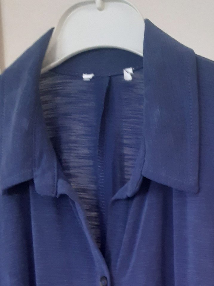 Kadınlar için keten kumaştan, yakalı ve düğmeli lacivert gömlek. Bol kesim ve uzun boy, günlük sokak stili için uygundur.