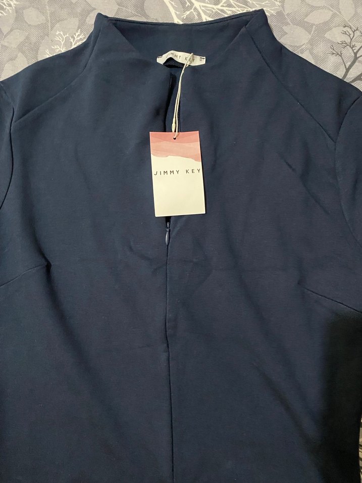 Bu dar kesim midi elbise, yüksek yakalı ve uzun kolludur. İpek gibi kumaştan yapılmış, koyu mavi rengi ve minimal tasarımıyla ofis için zahmetsiz şıklık sunar. Cesur görünümler için uygundur.