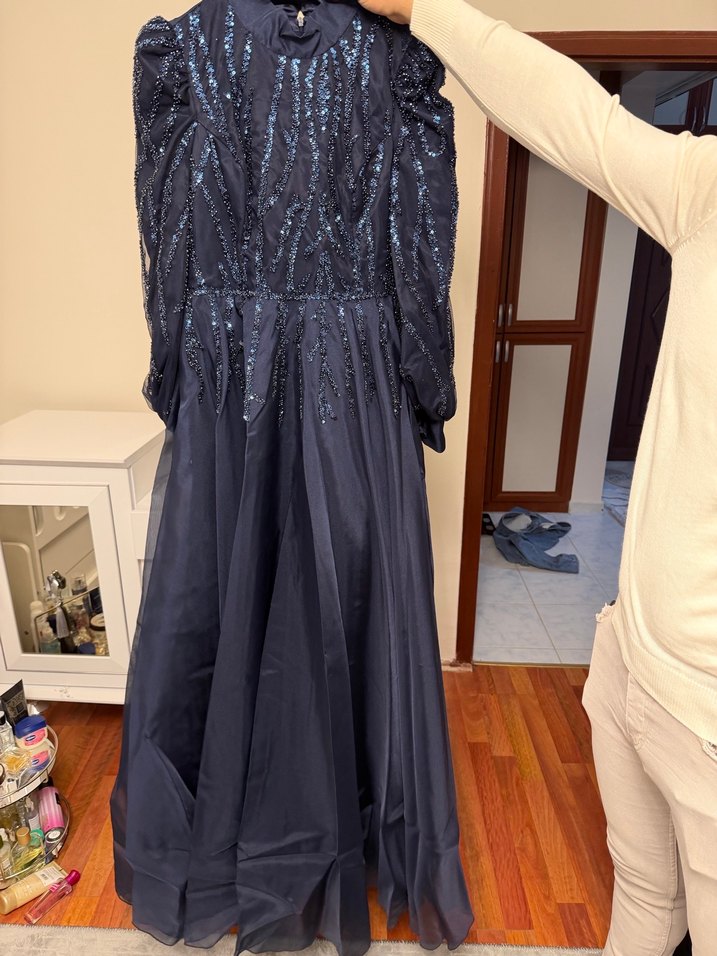Lacivert, uzun kollu ve nakışlı bu abiye elbise, klasik şıklık sunar. Drapeli ve vücuda oturan kesimiyle düğünler için uygundur. Bir kere giyildi42-44 beden aralığında ✨