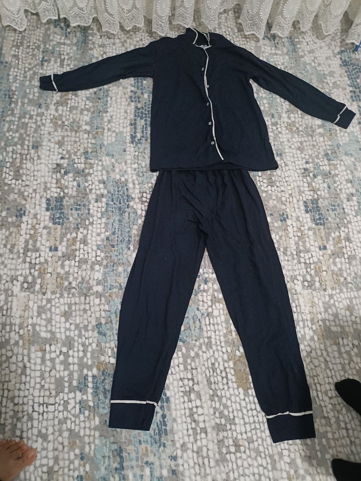 Kadınlar için uzun kollu, normal boyda ve regular fit lacivert pijama takımı. Beyaz ince şerit detaylarıyla rahat ve şık bir uyku kıyafeti.