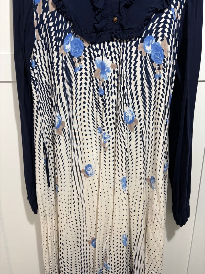 Kadınlar için uzun kollu, yüksek yakalı ve pilili tasarımlı uzun elbise. Defosu yok düğmeleri zamanla aşınmış cepleri mevcuttur