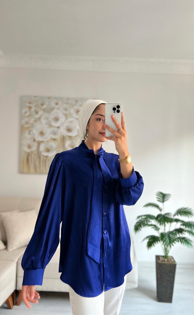Kadın Lacivert Uzun Kollu Salaş Saten Gömlek