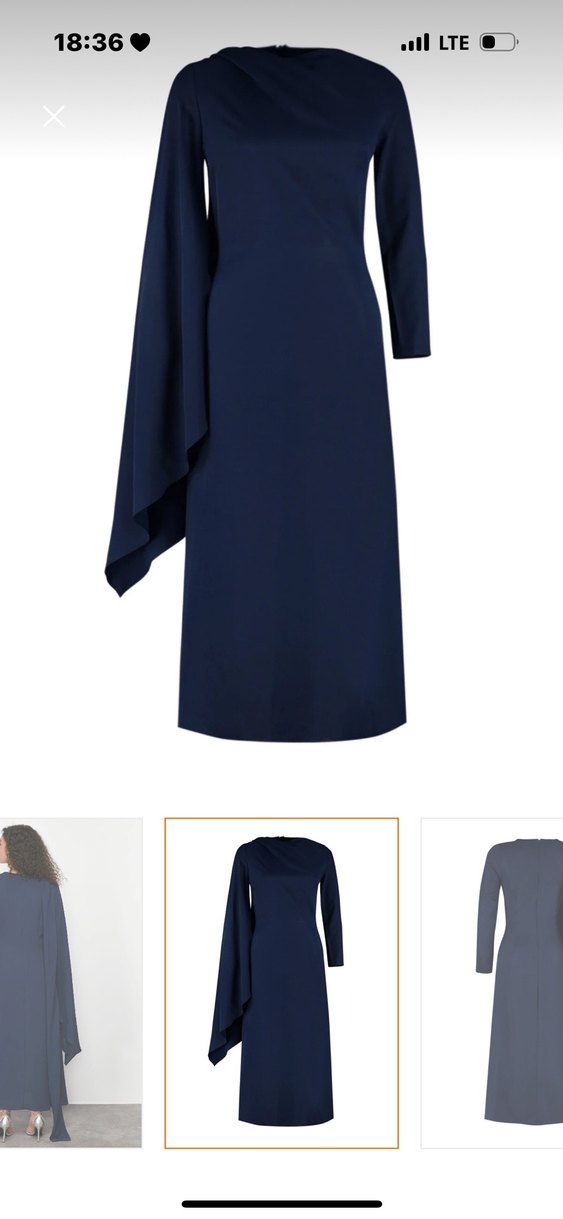 Lacivert renkte, uzun kollu ve tek parça uzun elbise, drapeli tasarımı ve kayık yaka detayıyla klasik ve minimalist bir şıklık sunar.