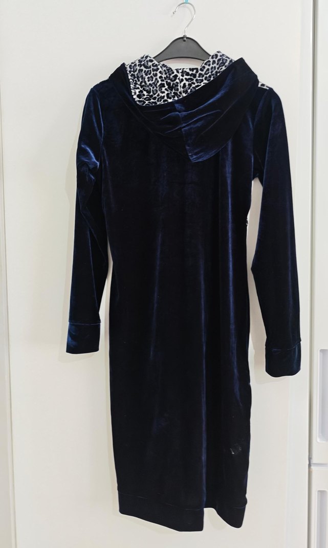 Kadınlar için uzun kollu ve uzun boylu, lacivert kadife kumaştan, gövdeye oturan goth tarzda bir elbisedir. Kapüşonun iç kısmında baskılı desen bulunur.
