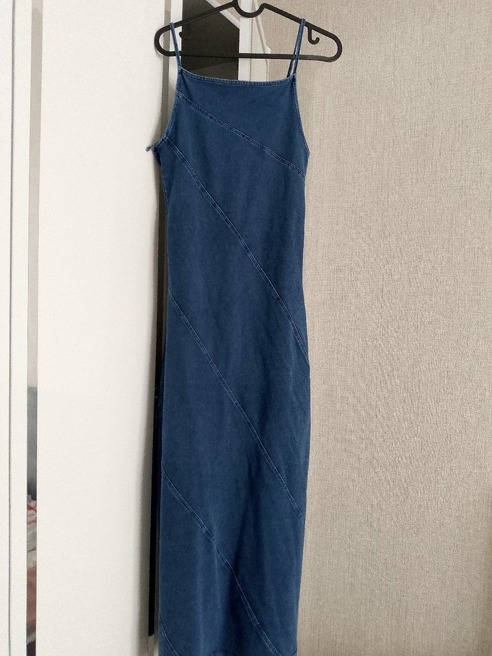 Lacivert kot kumaştan, kolsuz ve vücuda oturan uzun elbise. Yüksek yakalı ve drapeli detaylara sahip, rahat ve şık görünüm sunar.