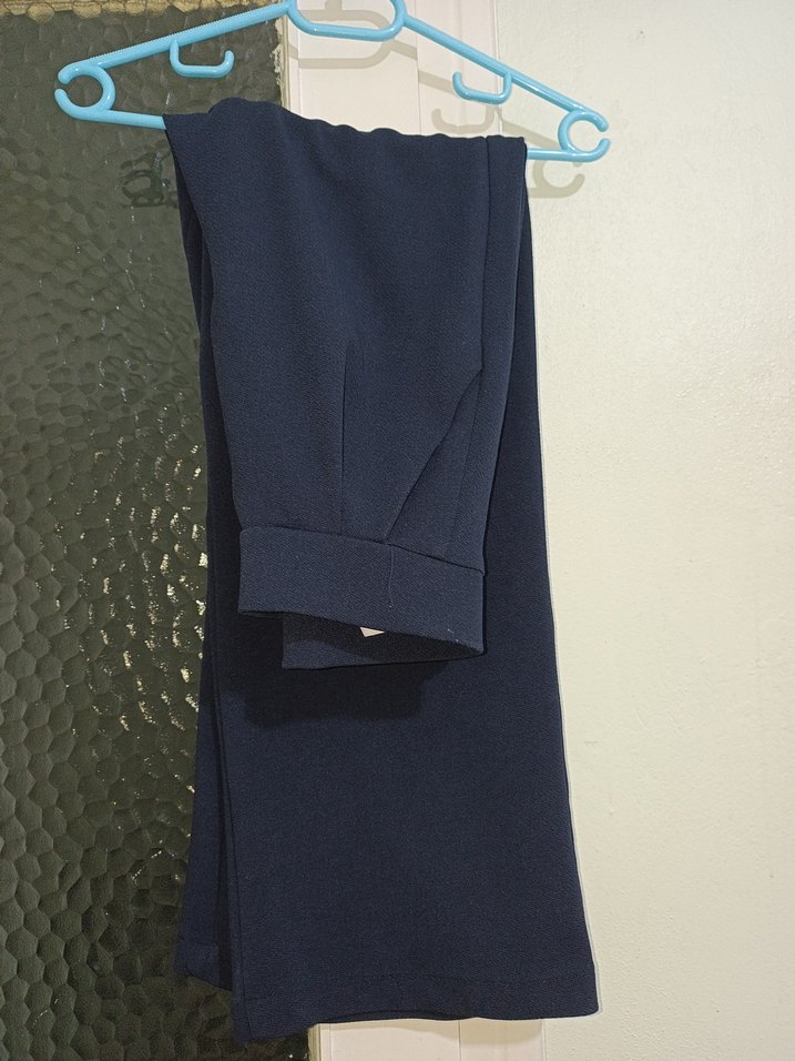 Kadın lacivert uzun,cırtcırtlı kumaş pantolon, yüksek bel,bol kesim.Hiçbir kusuru yok.