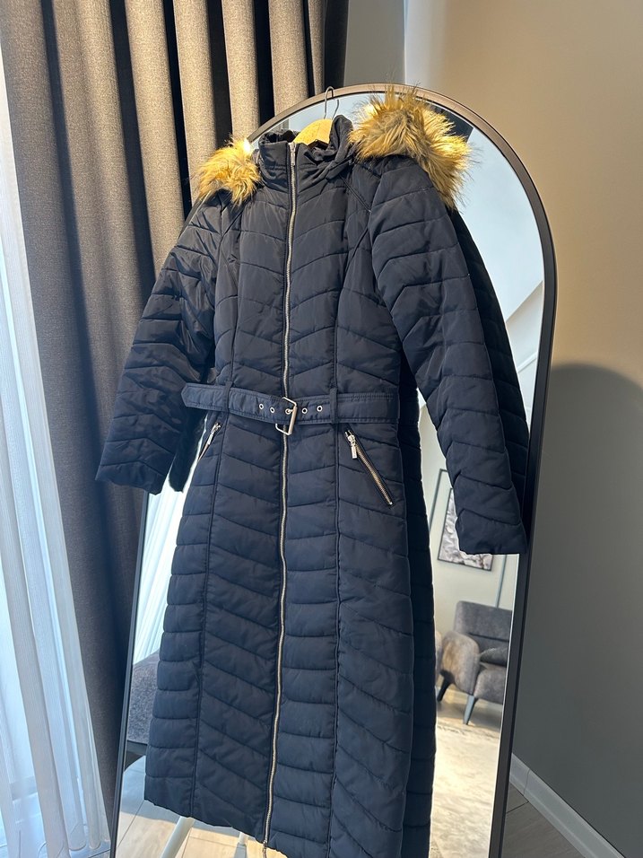 Bu lacivert kemerli ve uzun kış montu, kürk detaylı kapüşon ve askılı kollara sahiptir. Çıtçıtlı yakası ve fermuarlı cepleriyle rahat sokak stili için uygundur. ❄️ürün 36 bedendir fakat 38 bedenlede uyumludur