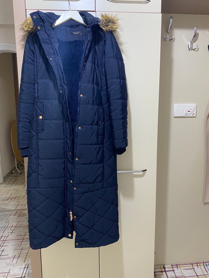 Lacivert uzun kışlık mont, kürklü birkaç defa giydim hiçbir defosu yoktur kalıp olarak 38 beden olanlarda tercih edebilir