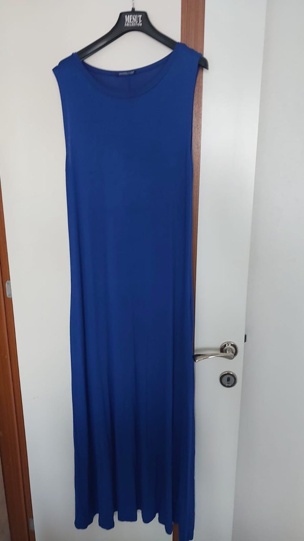 Lacivert, süprem kumaştan, uzun, kolsuz ve oturan kesim elbise. Kayık yaka ve bol tasarım, sade ve minimalist tarzda günlük kullanıma uygun.42-44 bedene uygundur
