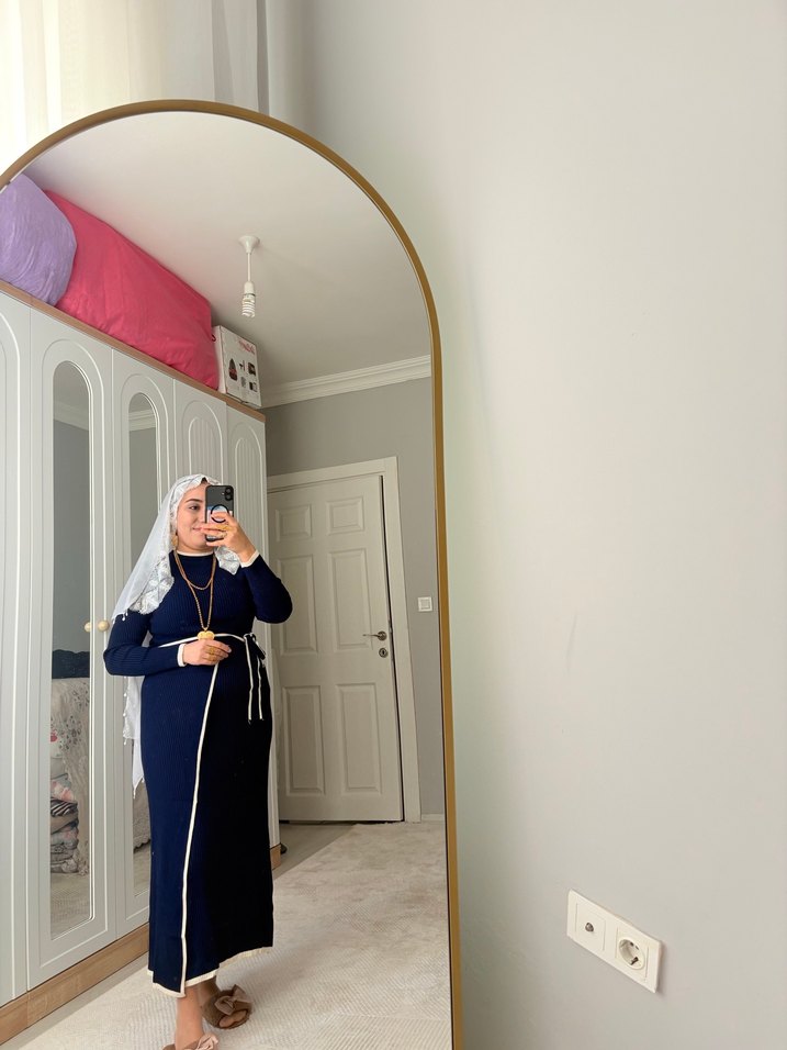 Lacivert uzun elbise, yüksek yakalı ve uzun kolludur. Yumuşak pamuklu kumaştan yapılmış, rahat bir kesime sahiptir. Minimalist, desensiz tasarımıyla günlük şıklık sunar.