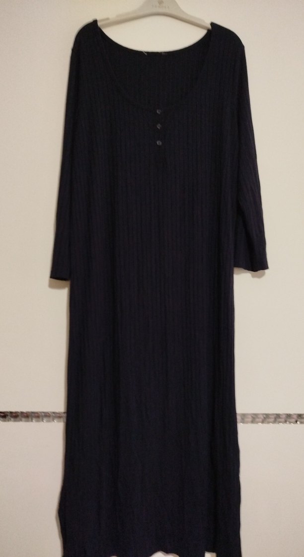lacivert renkli, penye kumaştan uzun, bol kesim elbise. Uzun kollu ve kayık yaka, pile detaylı, sade ve mütevazı tarzda günlük kullanım için uygundur.