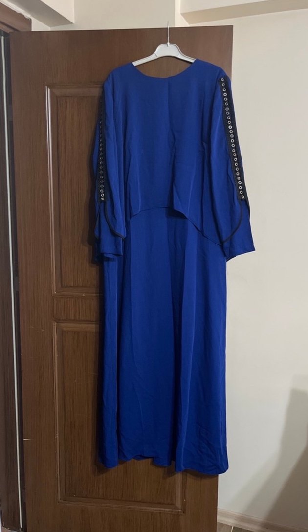 Kadınlar için uzun, lacivert salaş elbise, uzun kollu ve kuş gözü detaylı. Yuvarlak yakalı, drapeli ve desensiz sade tasarımıyla günlük kullanıma uygun.