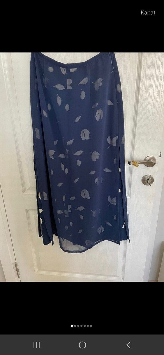 Kadınlar için uzun, salaş kesim ve drapeli tasarıma sahip, lacivert ve ipeksi kumaştan yapılmış etek. Minimalist ve ofis kullanımı için uygun desenli model. yanlarda yırtmaçı var ama sadece tülde.