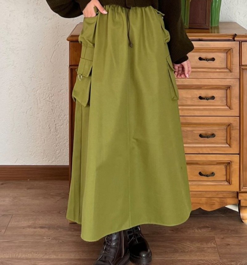 lacivert renkli, belden sıkmalı yan cepli, uzun ve salaş kesim etek.