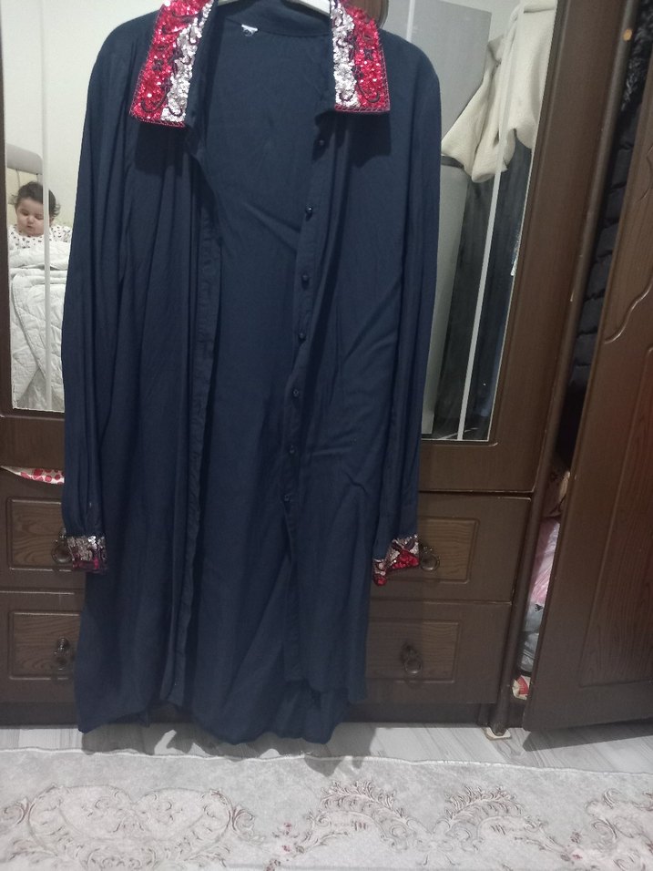 Kadınlar için uzun, salaş kesim ve uzun kollu lacivert sabahlık. Yaka ve manşetlerde payet detayları bulunan sade tasarım. ✨