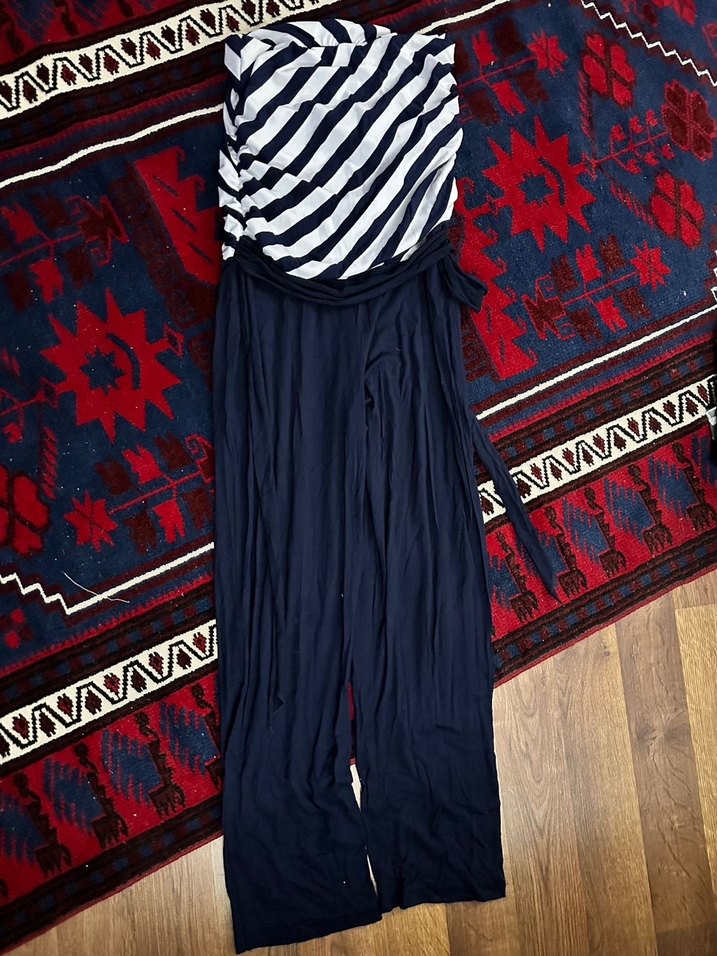 Kadınlar için lacivert ve beyaz çizgili, askısız drapeli üst ve uzun, salaş pantolonlu tekstil tulum. Rahat sokak stili için uygun.