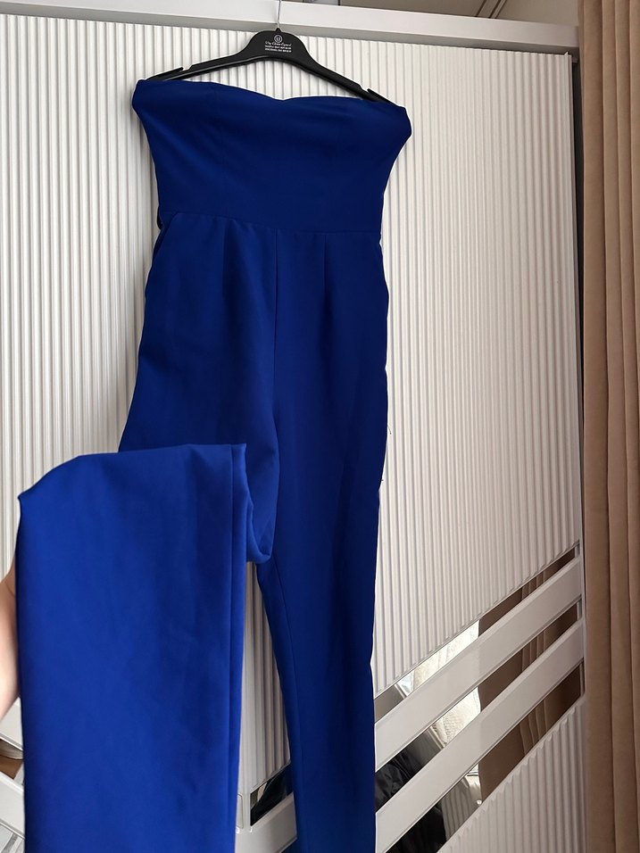Lacivert uzun straplez tulum, kemerli ve askılı kollu, yumuşak sentetik kumaştan. Minimalist tasarımıyla sokak modasına uygundur.