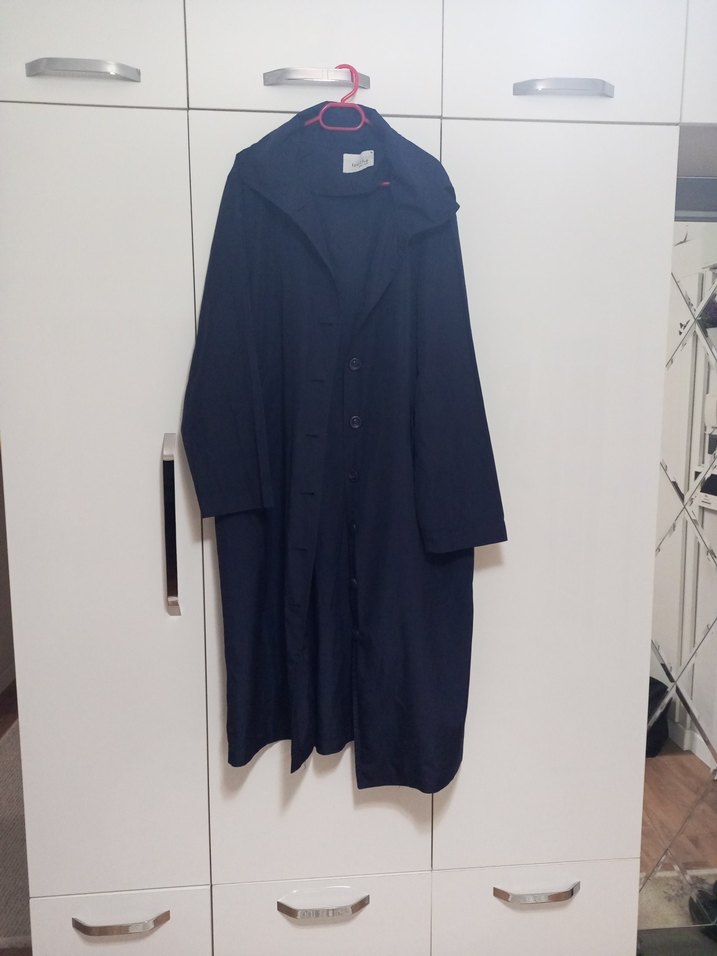 Lacivert, uzun kesim keten kadın kaban, yakalı ve düğmeli. Rahat kesim, uzun kollu, minimalist stil ve ofis kullanımı için uygun.