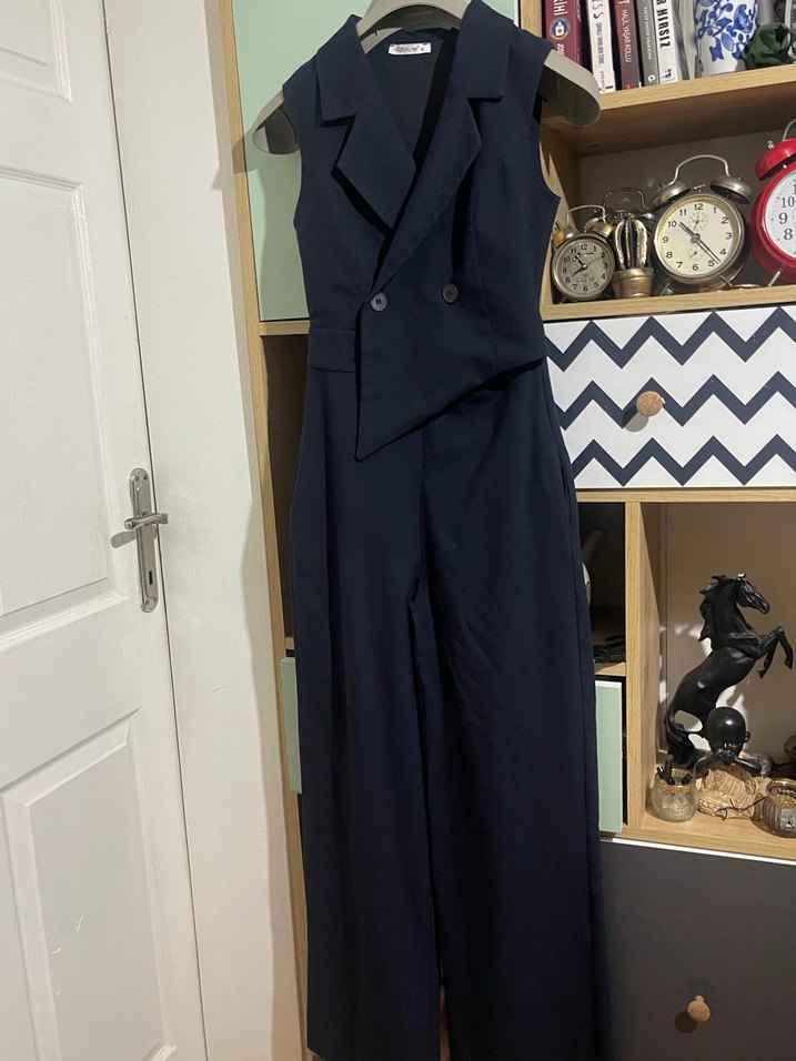 Kolsuz, düğmeli ve kesimli yaka detaylı kadın tulumu, lacivert renk ve sentetik kumaştan üretilmiştir. Ofis kullanımı için uygundur.