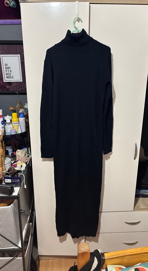 Lacivert uzun elbise, yüksek yakalı ve uzun kollu, vücuda oturan kesimiyle sade ve şık bir görünüm sunar. Günlük kullanıma uygundur.