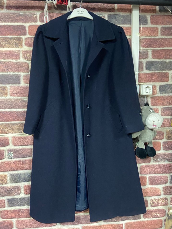 Kadınlar için uzun lacivert yün kaban, kesik yakalı ve düğmeli ön kapamalı. Ofis kullanımı için uygun, klasik tarzda ve düz renkli.
