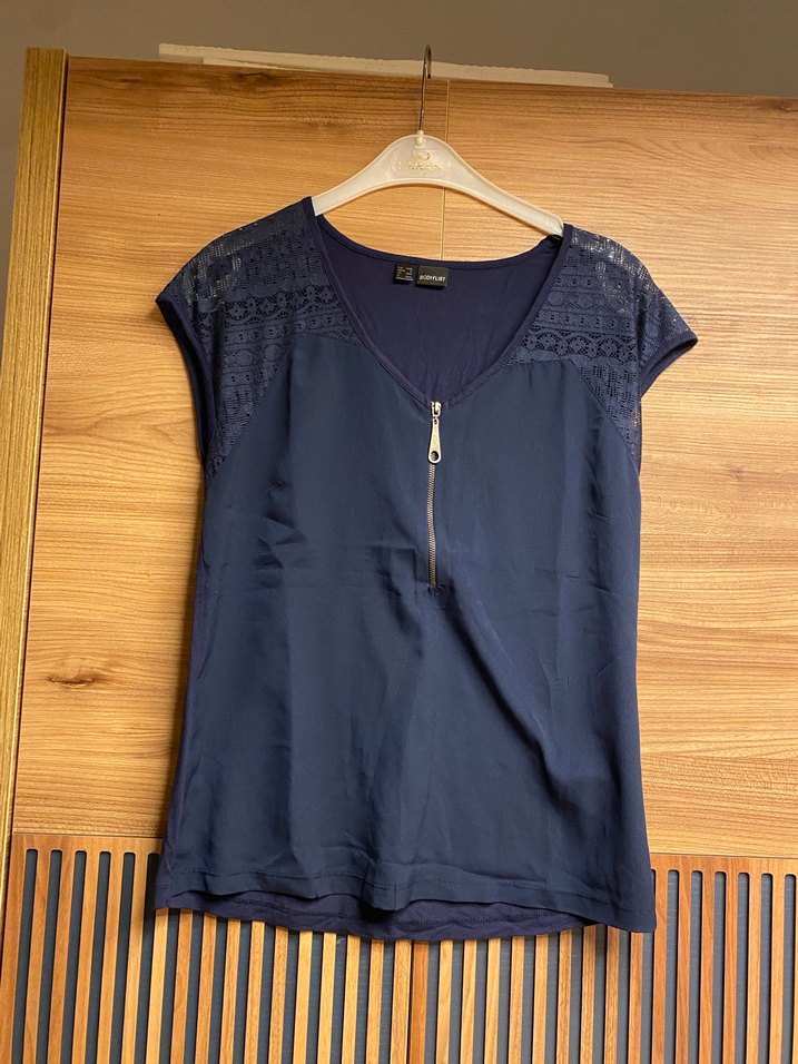 Lacivert renkte, V yaka ve kısa kollu kadın bluz, omuzlarda dantel detaylıdır. Rahat kesim ve önde fermuarı vardır, yumuşak sentetik kumaştan üretilmiştir.