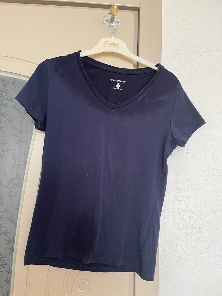 Kadınlar için V yaka ve kısa kollu, bol kesim pamuklu tişört. Koyu mavi renkte, günlük kullanıma uygun sade tarzda.