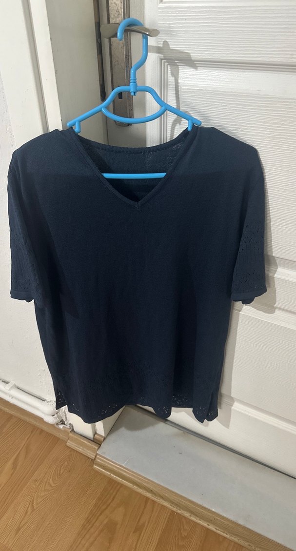 Lacivert V yaka kısa kollu tişört, yumuşak pamuk kumaştan üretilmiştir. Salaş kesimi ve midi boyu ile rahat, şık bir görünüm sunar. Günlük kullanım için uygundur. Trikodur ince İki koltuk altı 57 cm Koltuk altı etek boy 50 cm Komple boy 73 cm