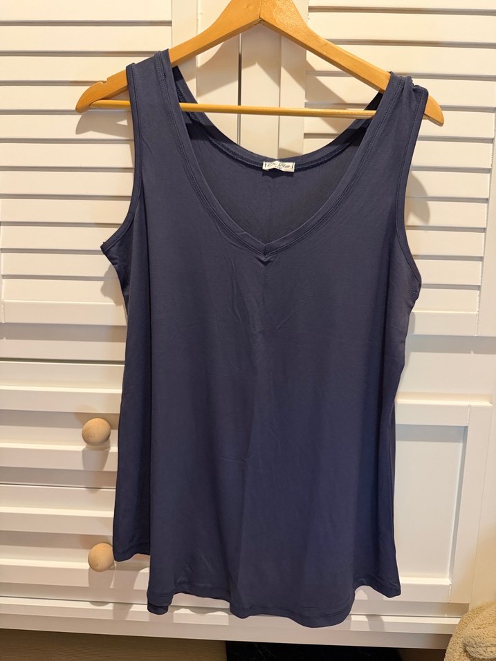 Kadın kolsuz, V yakalı, midi boyda ve bol kesim bluz. Lacivert, ipeksi dokulu kumaştan, günlük rahat sokak stili için uygun. L ve XL