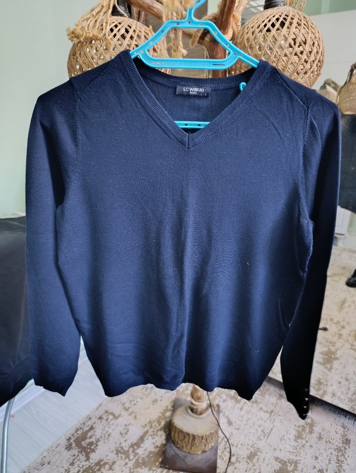 Lacivert renkte, V yaka ve uzun kollu kadın kazak. Pamuklu örgü kumaştan, rahat kesimli, günlük sokak stili için uygun.