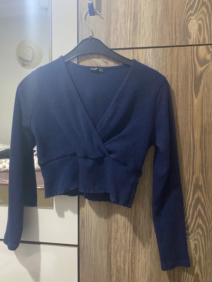 Lacivert, V yakalı, uzun kollu, triko dokuma kadın bluz. Normal midi boyda, sade desensiz, günlük rahat kullanıma uygun.