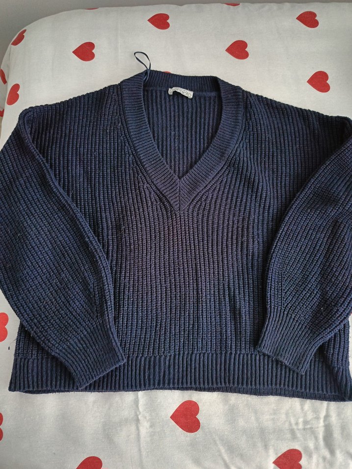 Lacivert renkte, V yaka ve uzun kollu, bol kesim triko kazak. Normal boyda ve desensiz, rahat tarzıyla günlük kullanıma uygundur.