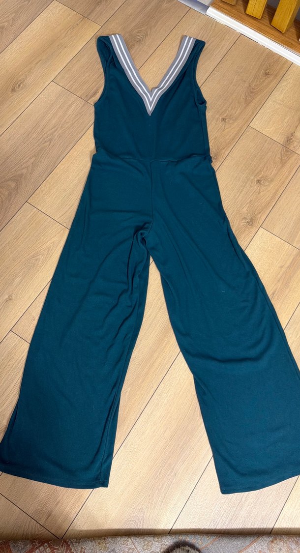 Kadınlar için lacivert, V yaka, kolsuz, vücuda oturan uzun tulum. Yumuşak sentetik kumaştan, spor ve günlük rahat stil için uygundur. M bedenede olur